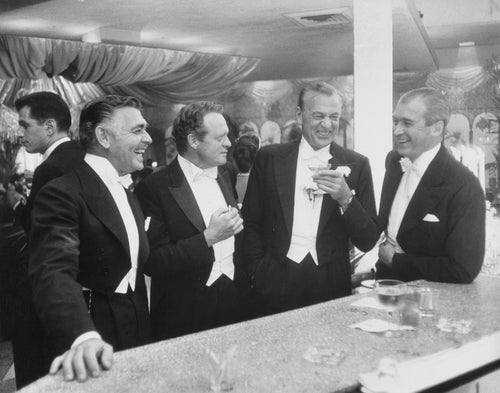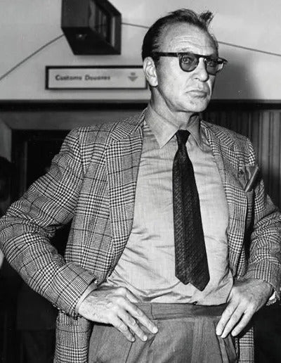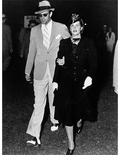 1948. Un premier oscar obtenu pour Sargeant York, Cooper est désormais une star. Photographié ici avec le fils du président Roosevelt, il porte des pantalons amples, des revers et une taille haute. Frank James est devenu Gary. Blazer et gilet sont assortis à un pantalon rayé. Helena, Montana devient Los Angeles, Californie. Il porte une veste de smoking avec un gilet crème, une cravate club et un morning trouser. Marshall dans High Noon, il choisit une cravate à pois noirs, un gilet à rayures grises et un col penny. Il sera nommé quatre fois de plus aux Oscars.