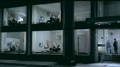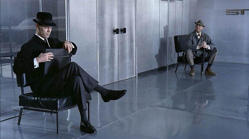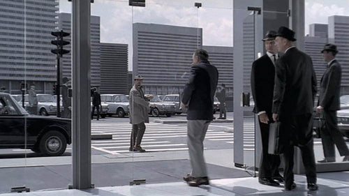 L’architecture moderne des gratte-ciels, des halls d’aéroport et des bureaux entre en résonance avec la rigueur des costumes portés par les personnages. Le monde est standardisé : les grandes barres bétonnées sont le pendant des costumes trois boutons en flanelle grises portés par les travailleurs. Ces derniers viennent aux bureaux en tenant le même attaché case noir, chaussés des mêmes souliers en cuir noir parfaitement cirés. Dans cette société de consommation, les hommes aussi sont eux-aussi devenus des produits.