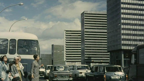 Playtime, sorti en 1967, est le quatrième long métrage de Jacques Tati. Le réalisateur y multiplie les jeux de lignes et de surface. Un camaïeu de gris bleuté où se mêlent structures d’acier, de verre et de béton.