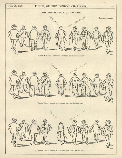 In the late 1920s, in reaction to the previous decade's trend for fitted suits, Oxford students began wearing wide-leg pants with exaggeratedly large leg openings. The trend for "Oxford bags" was born and soon spread throughout society, with the 1930s marked by these loose-fitting pants.