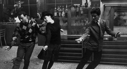 Claude Brasseur is sporting an argyle sweater in almost every scene while Sami Frey is the more daring of the two. The now classic dance scene shows Frey wearing a double-breasted peak lapel blazer in a chalk stripe fabric. Vents could have helped Frey to move those hips more elegantly. Noticeably, his straight black trousers do not match the jacket, adding to the innocent informality of his appearance. The famous Louvre scene meanwhile gives the camel coat a newfound youthful, energetic appearance.