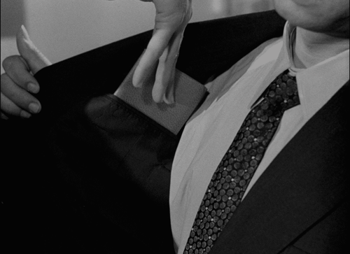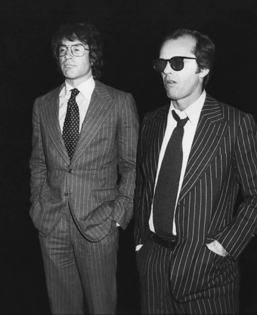« He had on a double-breasted suit of the type then known as the pillbox; it was chalk-striped, pink on blue »
