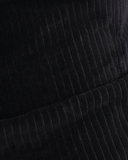 Pantalon taille haute, jambe évasé, en velours côtelé de coton, viscose et lin italien.